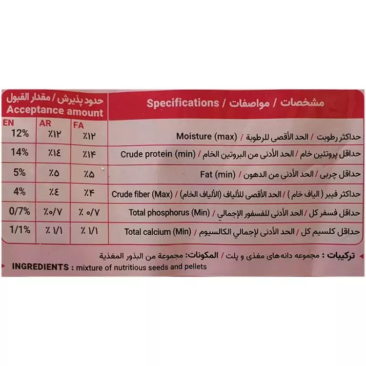 این خوراک کامل به علت اینکه مخلوطی از اکسترود، دانه های مغذی،میوه خشک و غلات می باشد بسیار خوش خوراک و خوش طعم است و قابل استفاده برای طوطی سانان کوچک جثه مانند عروس هلندی، طوطی کوتوله و گرینچیک میباشد. این محصول در طی پروسه تولید با اشعه ی یووی ضدعفونی شده و بسته بندی بهداشتی با متالایز جهت حفظ خواص دارد. باعث جلوگیری از سوتغذیه، تقویت سیستم ایمنی و حافظ سلامت و شادابی پرنده میباشد. این محصول در بسته بندی یک کیلوگرمی عرضه می گردد. مشخصات وزن: 10000 گرم درصد فیبر: 4 درصد درصد چربی: 5 درصد درصد پروتئین: 14 درصد