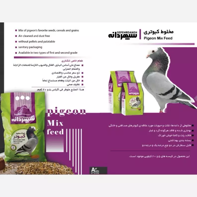 کبوترها به صورت سنتی اغلب با جیره های تمام دانه ای تغذیه میشوند. رژیم های تمام دانهای اغلب انرژی و چربی بالایی داشته و از نظر مواد مغذی و ویتامینها فقیر هستند. شرکت سپهر دانه با در نظر گرفتن نیازهای تغذیهای کبوتران خانگی اقدام به تولید پلت نموده است. این غذا در کنار رژیمهای دانهای میتواند نیازهای غذایی کبوترها را به خوبی برآورده کند. – مخلوطی از دانهها: غلات و حبوبات مورد علاقهی کبوترهای مسافتی و خانگی – بوجاری شده و فاقد هرگونه گرد و غبار – فاقد پلت و کاملاً خوش خوراک – بستهبندی بهداشتی