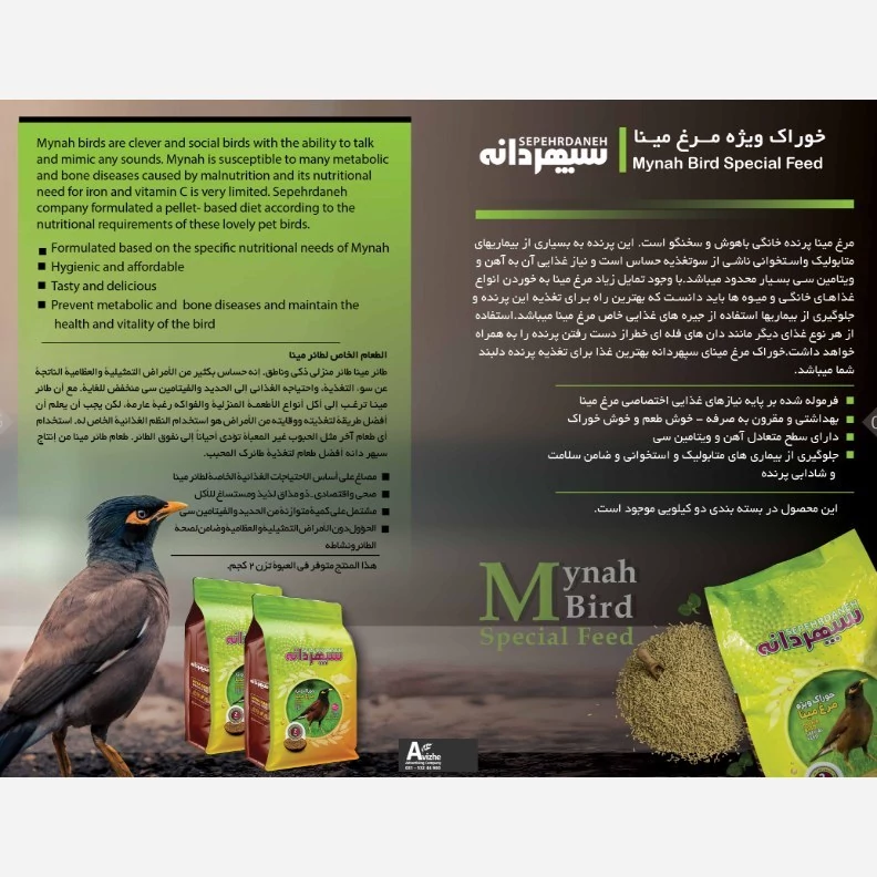 مرغ مینا پرنده خانگی باهوش و سخنگو است. این پرنده به بسیاری از بیماریهای متابولیک و استخوانی ناشی از سوتغذیه حساس است و نیاز غذایی آن به آهن و ویتامین سی بسیار محدود میباشد.با وجود تمایل زیاد مرغ مینا به خوردن انواع غذاهای خانگی و میوه ها باید دانست که بهترین راه برای تغذیه این پرنده و جلوگیری از بیماریها استفاده از جیره های غذایی خاص مرغ مینا میباشد.استفاده از هر نوع غذای دیگر مانند دان های فله ای خطر از دست رفتن پرنده را به همراه خواهد داشت.خوراک مرغ مینای سپهر دانه بهترین غذا برای تغذیه پرنده دلبند شما میباشد. – فرموله شده بر پایه نیازهای غذایی اختصاصی مرغ مینا – بهداشتی و مقرون به صرفه – خوش طعم و خوش خوراک – دارای سطح متعادل آهن و ویتامین سی – جلوگیری از بیماری های متابولیک و استخوانی و ضامن سلامت و شادابی پرنده– فرموله شده بر پایه نیازهای غذایی اختصاصی مرغ مینا – بهداشتی و مقرون به صرفه – خوش طعم و خوش خوراک – دارای سطح متعادل آهن و ویتامین سی – جلوگیری از بیماری های متابولیک و استخوانی و ضامن سلامت و شادابی پرنده – دانه های رنگی و مزه دار شده به همراه 30 گرم میل ورم