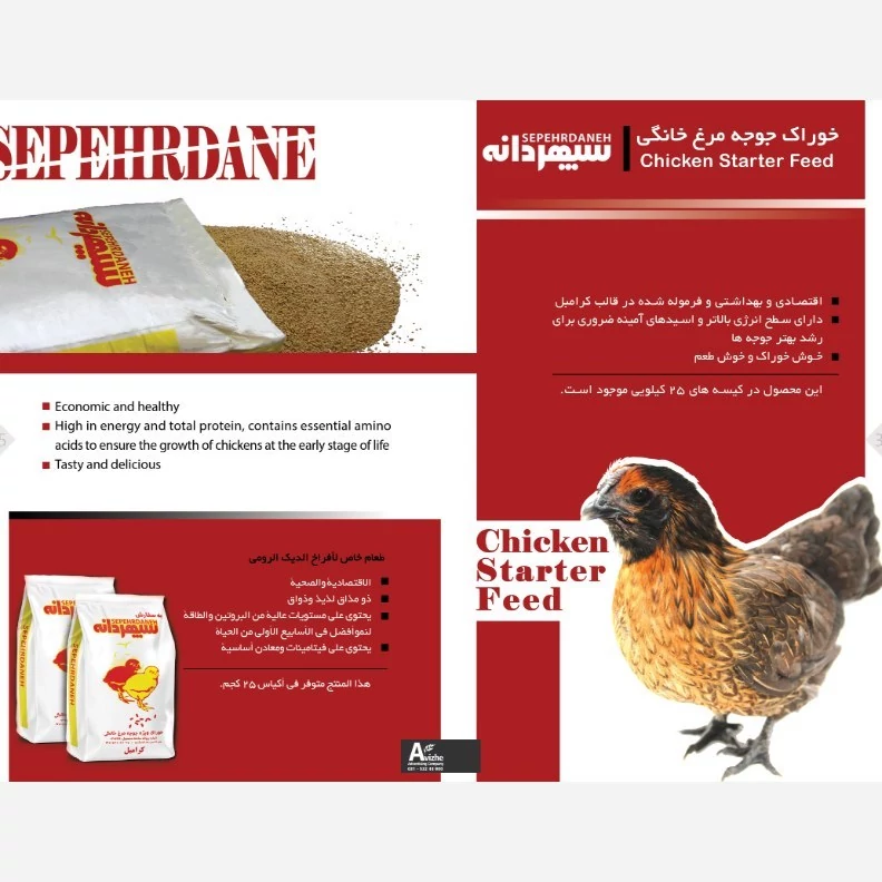 - اقتصادی و بهداشتی و فرموله شده در قالب كرامبل - دارای سطح انرژی بالاتر و اسیدهای آمینه ضروری برای رشد بهتر جوجه ها - خوش خوراك و خوش طعم